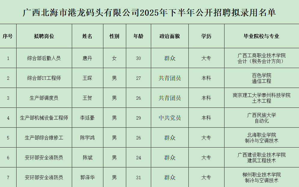 廣西北海市港龍碼頭有限公司 2025年下半年公開招聘擬錄用名單公示